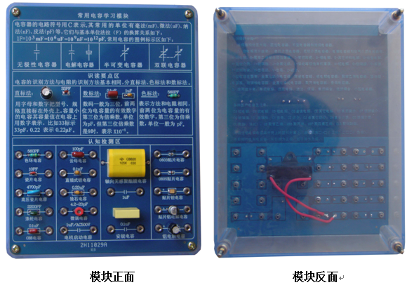 底盒使用190mm×145mm的开模有机透明塑料底盒,模块面板采用印制电路板PCB工艺,可以直观看到器件的实物及相关的原理介绍。对于典型应用及易损器件安装在面板背面,透过透明底盒能够看到器件实物,方便感性认识、检测测试,同时也能防止器件的损伤。