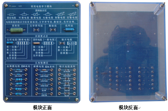 认知检测区:提供碳膜电阻,包括1/4W、1/2W、1W三类小功率共6个实际电阻,全部为E24系列阻值;金属膜电阻1/4W、1/2W、1W三类小功率共6个E96系列阻值实际电阻;贴片电阻类,包括1206、1812、2512三类封装形式共6个实际电阻。所有电阻两端提供可供检测的台阶插座(内孔2MM)。