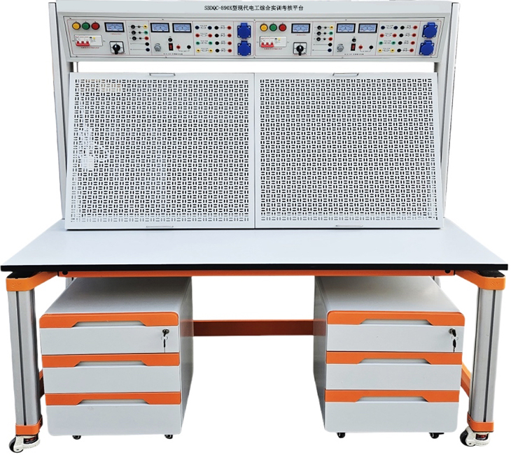现代电工综合实训考核实训台由实训屏(内置电源)、实训桌、实训储物柜三大部分组成。