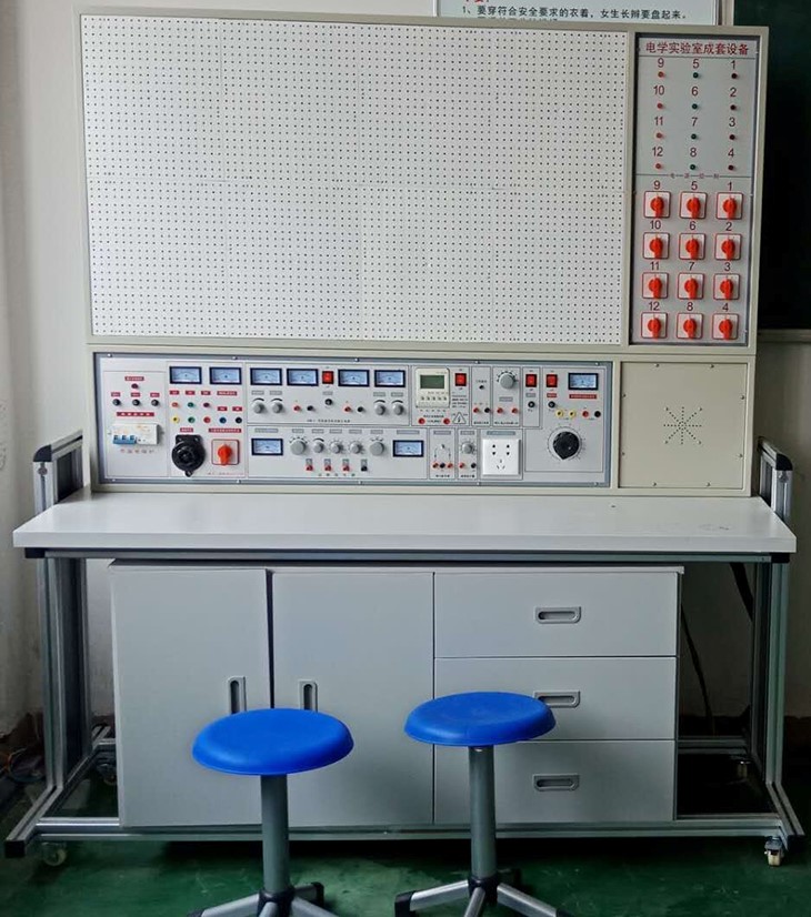 电子实验台具有较完善的安全保护措施,较齐全的功能(详见实验台结构简介)。实验桌中央配有通用电路板,电路板注塑而成,表面布有九孔成一组相互联通的插孔,元件盒在其上任意拼插成实验电路,元件盒盒体透明,直观性好,盒盖印有永不褪色元件符号,线条清晰美观。盒体与盒盖采用较科学的压卡式结构,维修拆装方便。元器件放置在实验桌下边左右柜内,大大提高了管理水平,规划化程度,大大减轻了教师实验准备工作。