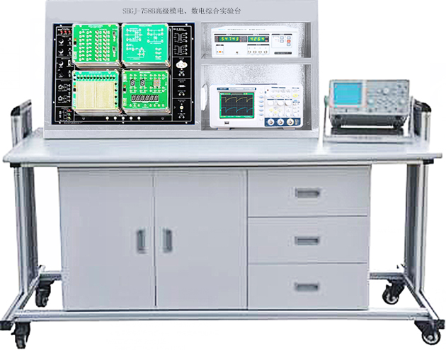 高级模电、数电综合实验台,模拟/数字电路调试系统以知识的综合应用和实践动手能力培养为出发点,通过所提供的实训平台,能够达到学生掌握特定技能的目的,体现创新设计的发展趋势。该系统实训的内容涵盖模拟电子技术、数字电子技术,电子产品电路的搭建、制作和调试,以及电子线路故障的查找、排除等内容。
