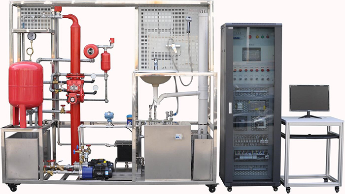 消防给水系统主要有给水箱、喷淋泵、稳压罐、湿式报警阀、压力开关、水流指示器、消防给水管道、闭式喷淋头等组成。管路采用镀锌管进行设计,可进行镀锌管的切割、套丝、安装和通水试验操作,通过控制系统可实现喷淋灭火功能。