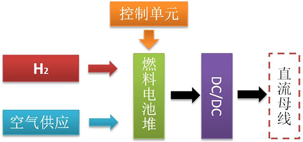 其工作原理是风力、光伏发电系统发电,并由电池储能,由储能逆变系统转换成交流电后接入电网,燃料电池单元所发的电能经DC-DC转换后送入直流总线作后备储能;系统可离网运行亦可并网运行,在网端能耗负荷内完成削峰填谷功能。