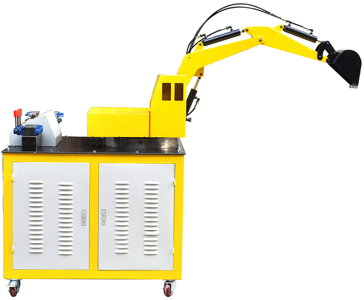 工业型挖掘机液压实训台能模拟真实挖掘机工作装置和回转机构的各种动作,最高工作压力可达7MPa,实训台由液压挖掘机工作装置、回转机构、液压传动系统、电器控制器件、可编程控制器(PLC)和实训桌组成,可实现挖掘、提升、回转、卸料等典型动作。其中,液压传动系统配备手动、PLC控制两种方式,分别由四组手动换向阀和电磁换向阀实现。通过操控本实训台,学生可以清晰地了解单斗液压挖掘机的液压元件组成、液压回路工作原理、典型动作控制方式和机械结构。