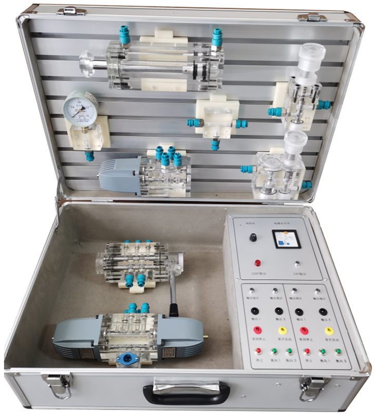 3、箱子集元件元件、液压泵站、调速电机及电气控制部分为一体箱,教师可方便的将设备带入课堂进行现场演示教学和实物讲解。