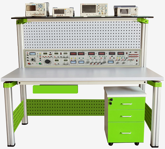 电子技术综合实验台主要由实验主机箱、仪器架、电源控制箱、独立实验电路模块、实验桌(含磁吸式实验基座)、储存柜、学生凳等组成。