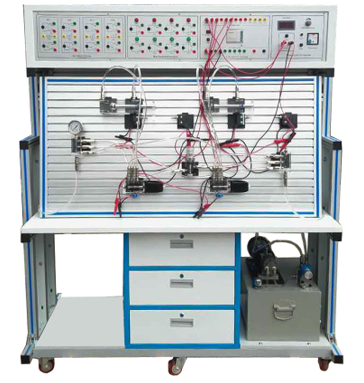 1、液压PLC控制实验台主要由实训桌、实训台、液压元件和电器控制器件、可编程控制器(PLC)等组件组成。