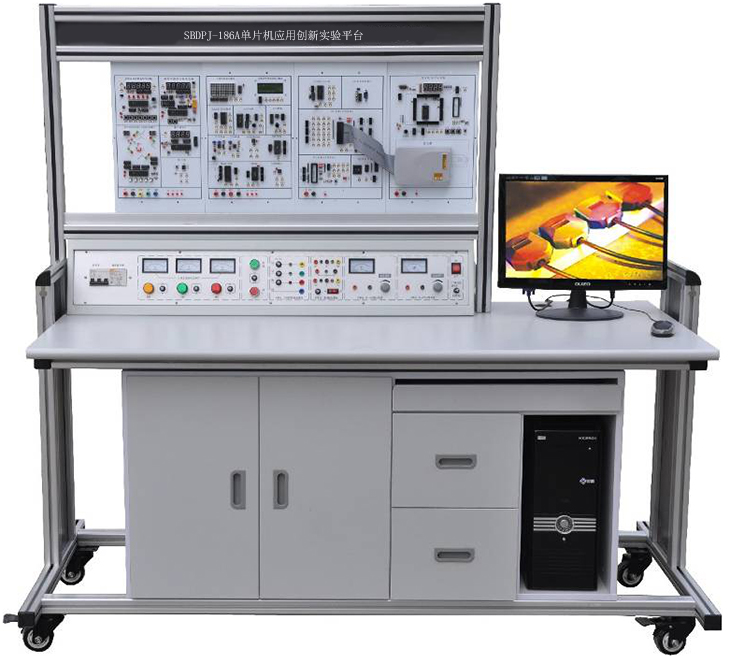 单片机应用创新实验装置由控制屏、实验挂箱、实验桌组成,通过本实验台可完成单片机的接口扩展、数据采集、数据显示、键盘控制、定时器、打印机接口等实验,配备有仿真器。