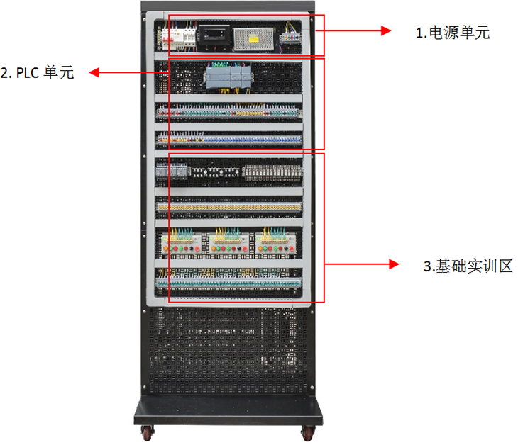 实训单元组成:网孔板实训区主要由电源单元、PLC单元、PLC学习箱单元、基础实训单元、小车运动单元、变频器单元等组成。