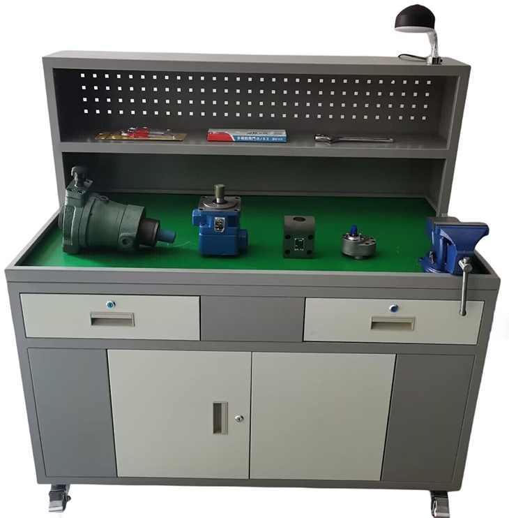 6、实训台:采用钣金结构设计,表面为双层亚光密纹喷塑工艺处理,台面采用下凹设计,增加台虎钳,以及绝缘防滑垫,同时为液压阀拆装时提供一个良好的接油、防震平台。
