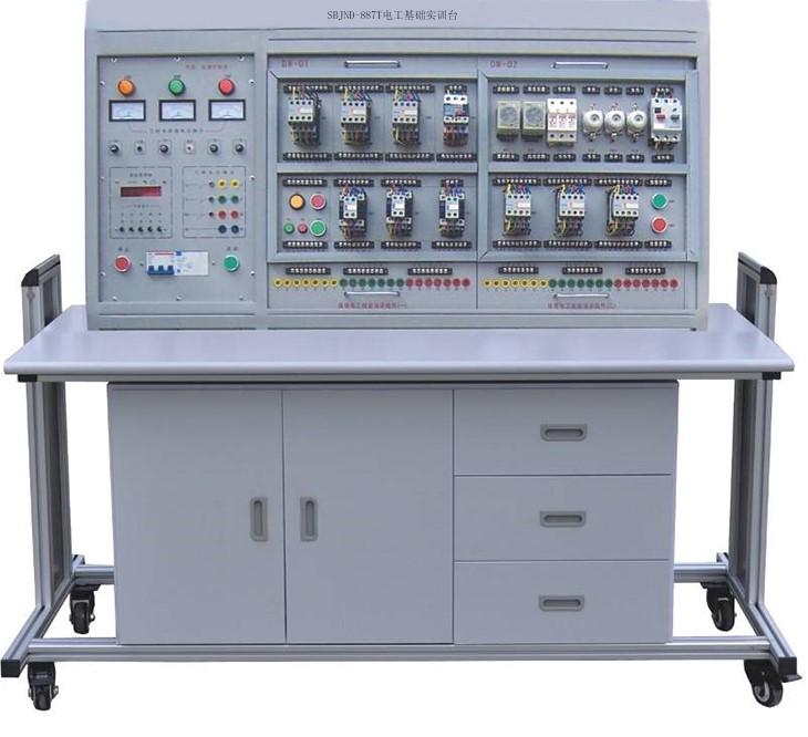 电工基础实训台为配合我国职业教育和就业人员实际操作、培训、鉴定的需求,我公司综合了大中专院校、职业院校、技工学校的《电力控制技术》《电力拖动控制线路与技能训练》《工厂电气控制技术》《继电接触控制技术》等相关科目的实验及实训教学内容而研发了本装置。装置采用挂箱结构,实训项目可扩展性强,可扩展PLC与变频调速实训项目。所有的元器件通过导线引到接线端子上,有利于保护器件,通过线槽走线,接近工业现场。