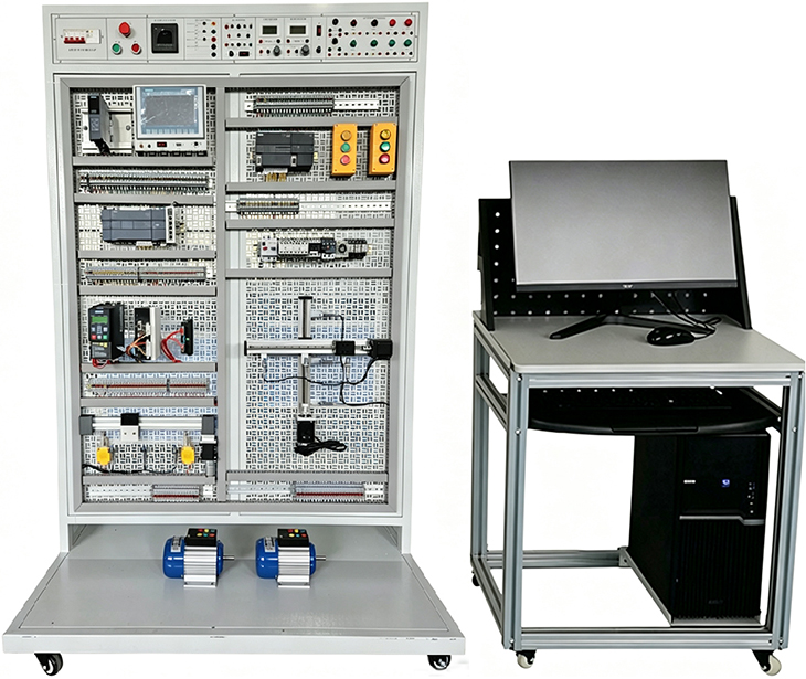 采用模块组合式结构,含开关量、模拟量、变频调速、触摸屏、通信模块等,配套MCGS工控组态监控软件,实现仿真化、信息化实训教学。
