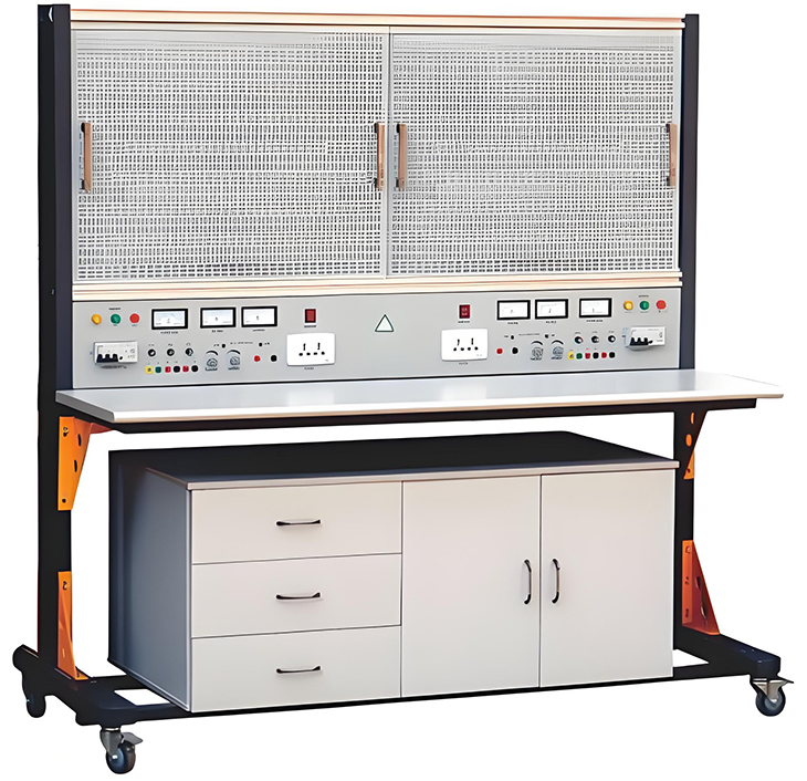 本实训台由实训屏(内置电源)、实训桌、实训储物柜三大部分组成。