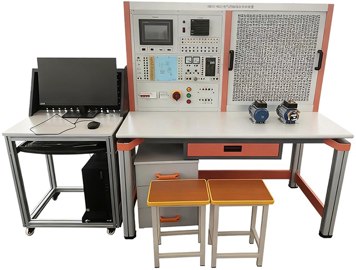 实验桌后面二支桌脚向上延伸,组成电源控制箱的固定支架,固定PLC主机单元与电源控制箱及网孔实训板。