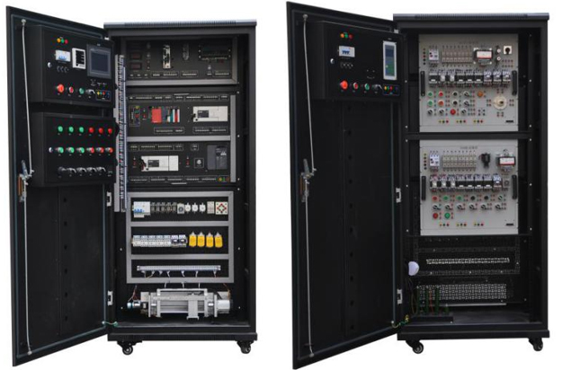 1.本装置是由控制柜、受控对象等组成一个完整系统,具有占地面积小、操作方便、可移动、内部安装有照明设施、操作面板,各控制点和通讯接口均引出到专用的接线板上,使实训更加便捷。