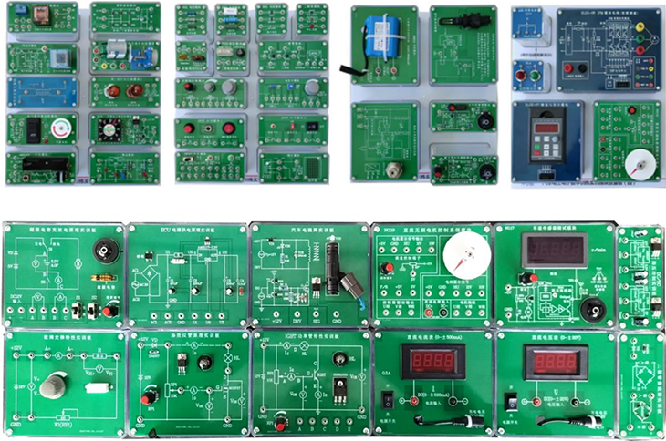 汽车电工电子基础实训模块由透明封闭元件盒及PCB板构成。元件盒体由透明有机工程塑料注塑而成,具有示教功能,使用者能够观察到元件形状和接线方式,有利于教师讲解和学生认识;面板采用PCB制作而成,表面清爽、符号线路清晰、元件更换容易。元件盒面板尺寸58mm*58mm,尺寸58mm*124mm124mm*146mm三种规格。