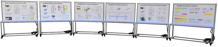 汽车检测实训台面板采用 ≥ 4mm 厚耐腐蚀、耐创击、耐污染、防火、防潮的高级铝塑板,表面经特殊工艺喷涂底漆处理;面板打印有永不褪色的彩色电路图;学员可直观对照电路图和原车实物,认识和分析各控制系统的工作原理。