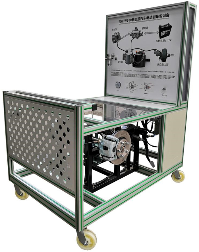 新能源汽车电动真空助力制动系统实训台选用吉利EV450 纯电动汽车电动真空助力液压制动系统;真实地展示纯电动汽车电动真空助力液压制动系统核心零部件的结构与控制原理、安装位置和运行工况,培养学员对纯电动汽车电动真空助力液压制动系统故障分析和处理能力。适合于各类院校对纯电动汽车电动真空助力液压制动系统理论和维修实训的拆装与维护、结构与原理认知、系统操作、功能动态演示、故障检测与诊断教学需要。