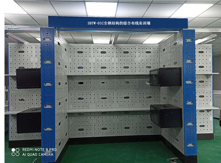 1)装置采用全钢结构,模拟一栋建筑楼宇内部真实环境,除可进行综合布线工程技能实训外,也适合于智能楼宇安防监控实训使用。采用2.0mm优质冷轧钢板,内置各种网络设备、插座、线槽、机柜等安装孔,保证20000次无尘重复操作;仿真墙内部采用高强度龙骨支架支撑,所有钢板通过高强度铆钉固定在龙骨支架上,墙面平整无任何凹槽,模块化组合安装,装置可全封闭,也可根据教学需求,实训装置背部全开放,学生可以直观看到墙体的内部,可在墙体内部根据教学需要,进行各种路由暗管安装。可视面积为≥6.24平方米。安全可靠,无尘化操作。如:8模块装置可同时或者交叉模拟网络综合布线工程的8个工作区、8个设备间、8个垂直、8个水平、8个管理等子系统实训。模块化设计,能按教室尺寸合理布局,适合任意楼层安装。