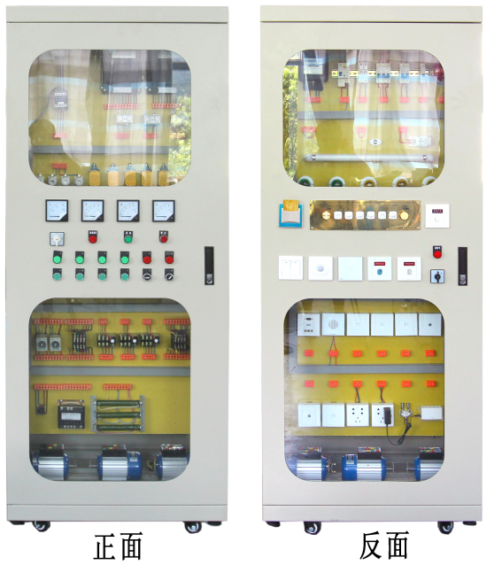 1、智能楼宇电工实训装置采用正反二面开门的离墙式威图电气控制柜,且正反面同时都可以操作,柜体中宽度能保证两个学生同时合作接线实训的需要,其外形尺寸宽××高分别为:800×600×2000 mm。柜体采用厚度为国标1.5以上的优质钢板,柜门采用厚度为国标2.0以上的优质钢板并安装四块大的玻璃,学生能通过玻璃看清柜内各元器件及相应的动作,金属表面喷塑,柜体中间有二块优质环氧树脂绝缘板和相应的支架系统隔离正反两个柜体,安装板上安装智能建筑电气控制线路各实训考核模块。各元器件所有的接线端都连接至相应的专用实训接线端子上,每个接线端上都套有用电脑打印接线端名称及编号的套管,并且更换方便。被控制电机安装于电气控制柜内。