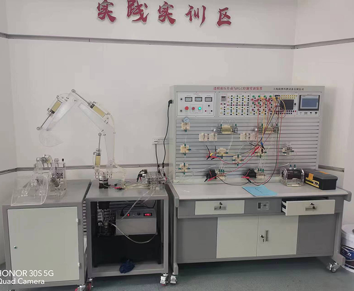 透明液压传动与PLC控制实训装置、液压PLC控制实训设备是我公司根据高校机电一体化对气、电、液控制的教学大纲要求,在我公司透明液压传动演示系统的基础上,综合了液压PLC控制实验设备的优点,采用了开放型综合实验台结构,广泛征求专家教授与老师的意见,经不断创新改进研制而成的。是目前液压传动控制技术以及PLC可编程序控制器控制技术于一体的理想的综合性实验设备。实验时,可以让学生直观、感性地对比、了解电、液各自具有的特点、特色、及优缺点等。液压实验元件均为透明有机材料制成,透明直观。便于了解掌握几十种常用液压元件的结构、性能及用途。掌握几十种基本实验回路的工作过程及原理。实验时,组装实验回路快捷、方便。同时,配备独立的继电器控制单元进行电气控制,简单实用。通过与PLC比较,可以加深对PLC可编程序控制器的了解及掌握。