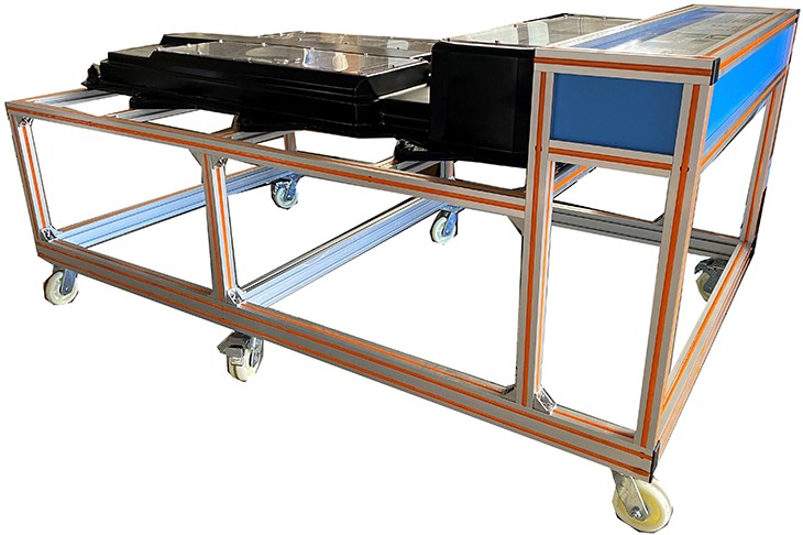 8.设备框架采用40mm×40mm40mm×80mm两种一体化全铝合金型材搭建,耐油耐腐蚀并易于清洁,经久耐用不生锈,带万向脚轮,便于移动,并带锁止机构。