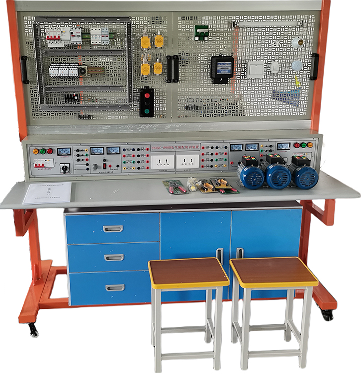 电气安装与调试综合实训平台由实训屏(内置电源)、实训桌、实训储物柜三大部分组成。
