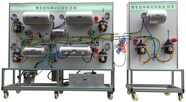 1.台架上具有的 全新陕汽SX2190N原车零部件有空气压缩机总成、空气干燥剂、前桥储气筒、后桥储气筒、手制动储气筒、再生储气筒、辅助储气筒、四回路保护阀、制动脚阀、驻车阀、ABS电磁阀、继动阀、制动管路、气压表若干个。