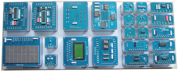 该模块将实际应用中单元电路模块化。学生通过模块间的搭接,很方便就能搭建成各种实际产品,模块搭成产品的范围涉及家电,工业,无线等方面内容。单元模块电路包括传感器,信号处理,显示,执行本体,接口电路,微处理器、通信等模块。模块都采用透明盒装配,模块间采用排插和接线柱连接,使实训模块能够灵活按教学要求或竞赛要求搭建成各种实际产品。线路板统一采用蓝色作为底色,清爽直观。连接采用铜制插孔和8脚白色排针,连接方便灵活。大部分电子元器件都为贴片封装,布局经凑。