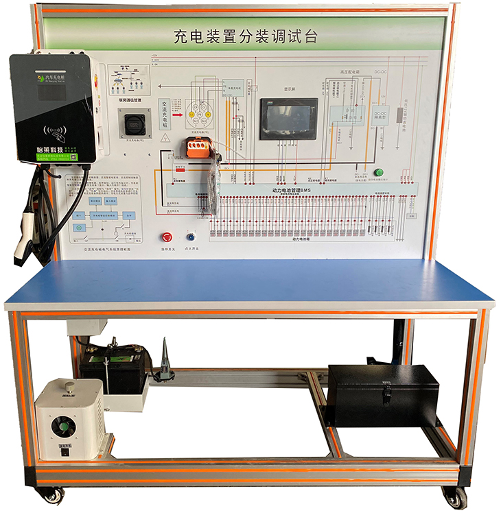 32A,7KW)、国标交流充电插座与充电枪、智能充电卡片、电池管理系统(电池管理系统,带CAN总线通讯/CC,CP控制线,7寸触摸彩屏,充电唤醒信号控制)、锂电池组(24串,3.2V20AH单体电池)、模拟指示灯、操作开关、DC-DC转换模块(72V-12V15A)、直流接触器(包含充电继电器、总正继电器、总负继电器、预充继电器)、带CAN通讯的车载充电机、急停开关与电源总开关、辅助蓄电池(12V45AH)、线性可调放电负载、一体化全铝合金型材搭建的移动台架(带自锁脚轮装置,带安装检测端子的原理面板,面板1448×940mm)、故障模拟与排除装置、设备操作说明书。