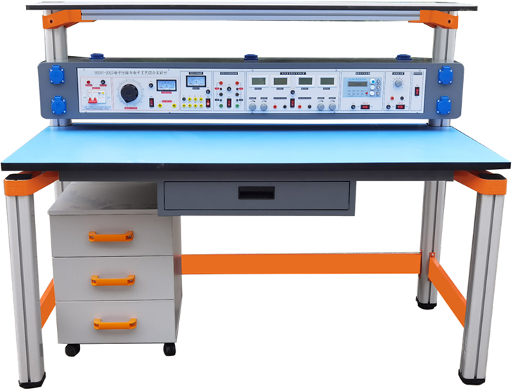 电子技能与电子工艺综合实训装置由仪器架、主机箱、实验桌、移动矮柜、学生凳等组成。实验装置支架与实验桌可组合、可拆装。支架与桌脚一体,铝合金结构。