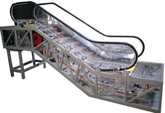 透明教学自动扶梯模型,适用于职业院校、中职院校电梯技术专业学员进行自动扶梯梯级拆装、操纵和维修保养实训教学训练。扶梯模拟实训装置采用优质方管焊接密纹喷塑组装成扶梯桁架,梯级踏板系统、扶手带系统、曳引机系统,设备台架、安全检测系统,电气控制控制系统等。